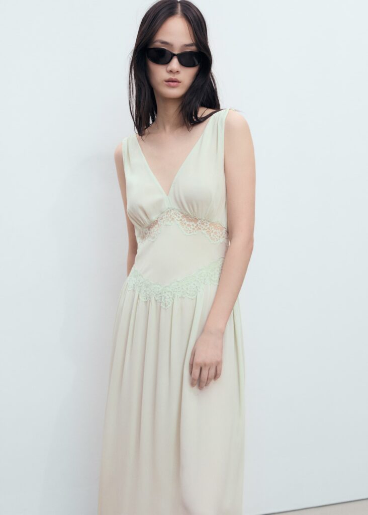 El vestido lencero en gasa con delicados detalles de encaje es otra pieza fundamental de la colección. Su diseño multisituación permite pasar de un encuentro casual a una ocasión especial sin perder estilo. Combinado con un blazer oversize y tacones, este vestido se adapta a la dinámica de la mujer moderna, que busca elegancia sin sacrificar comodidad ni practicidad.